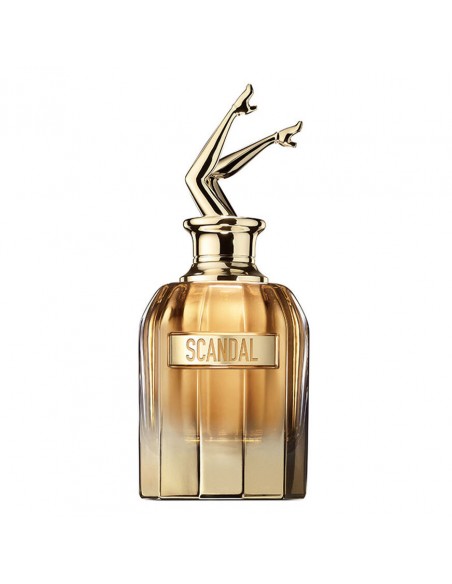 El icónico frasco de Jean Paul Gaultier Scandal Absolu Parfum Concentré dorado con su jugo cálido en su interior culmina con su mítico tapón dorado con las piernas doradas desnudas y sensuales que provocan el escándalo más absoluto.