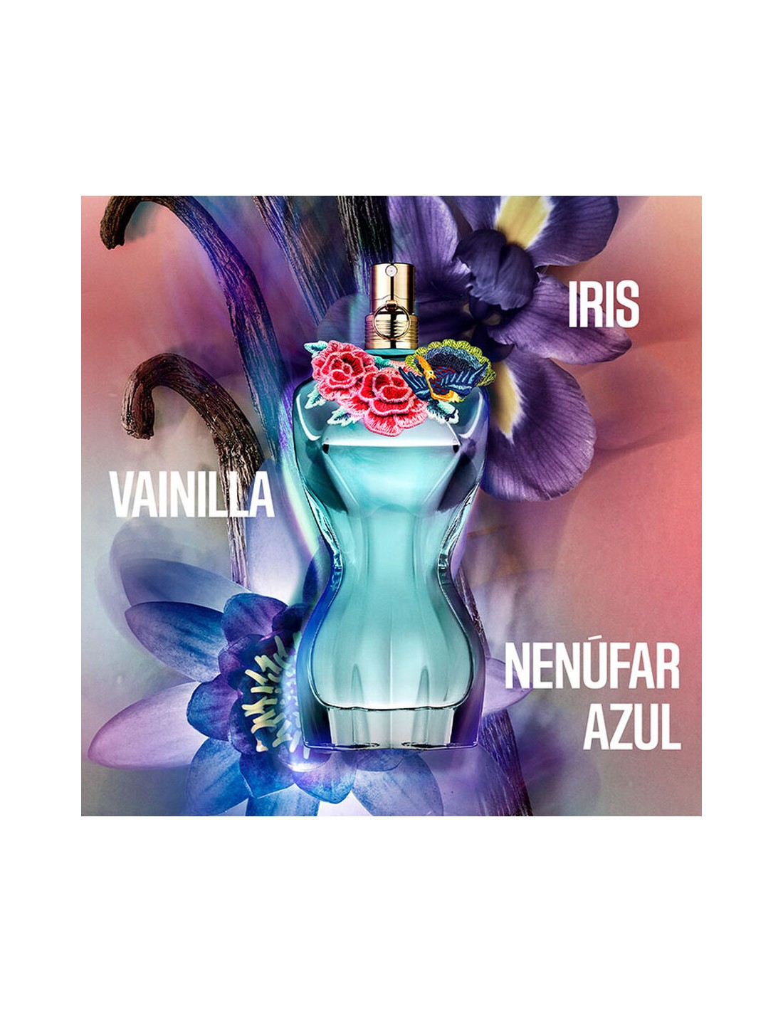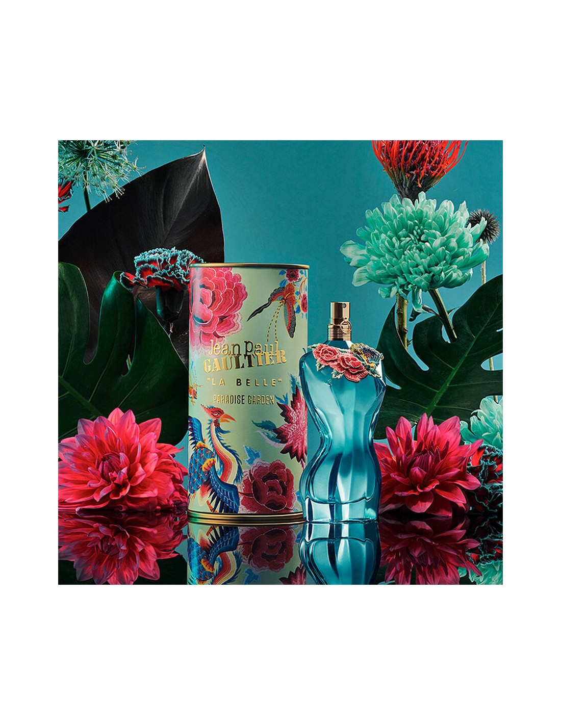 El frasco Jean Paul Gaultier Le Belle Paradise Garden Eau de Parfum refleja el cuerpo de una mujer desnuda, que posa sobre el jardín del Edén cubierta de rosas bordadas. Un vidrio azul laguna irradia la tentación de la belleza natural, representada con un cuerpo con curvas ultrafemeninas y sugerentes que incitan a descubrir su esencia más pura.