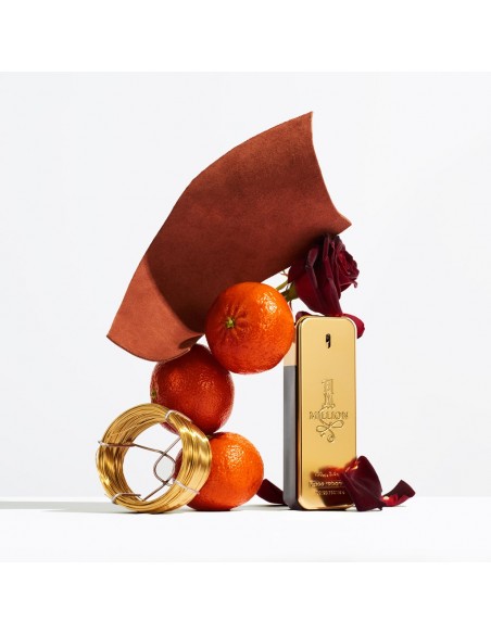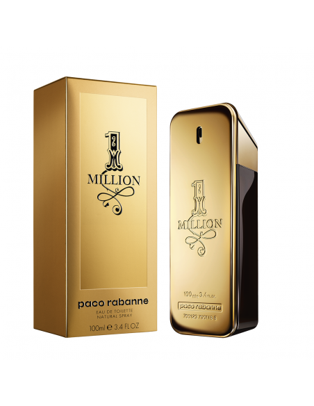 Para el hombre atrevido que juega con la seducción extrema... Su arma se llama 1 Million, un aroma fresco y chispeante, hecho de mandarina roja y menta piperita que se mezclan con esencia de rosa y canela y con un delicioso acorde de cuero y ámbar ketal en el fondo. Nada es suficiente para este seductor, cuyo frasco evoca la sexy forma de un lingote de oro.